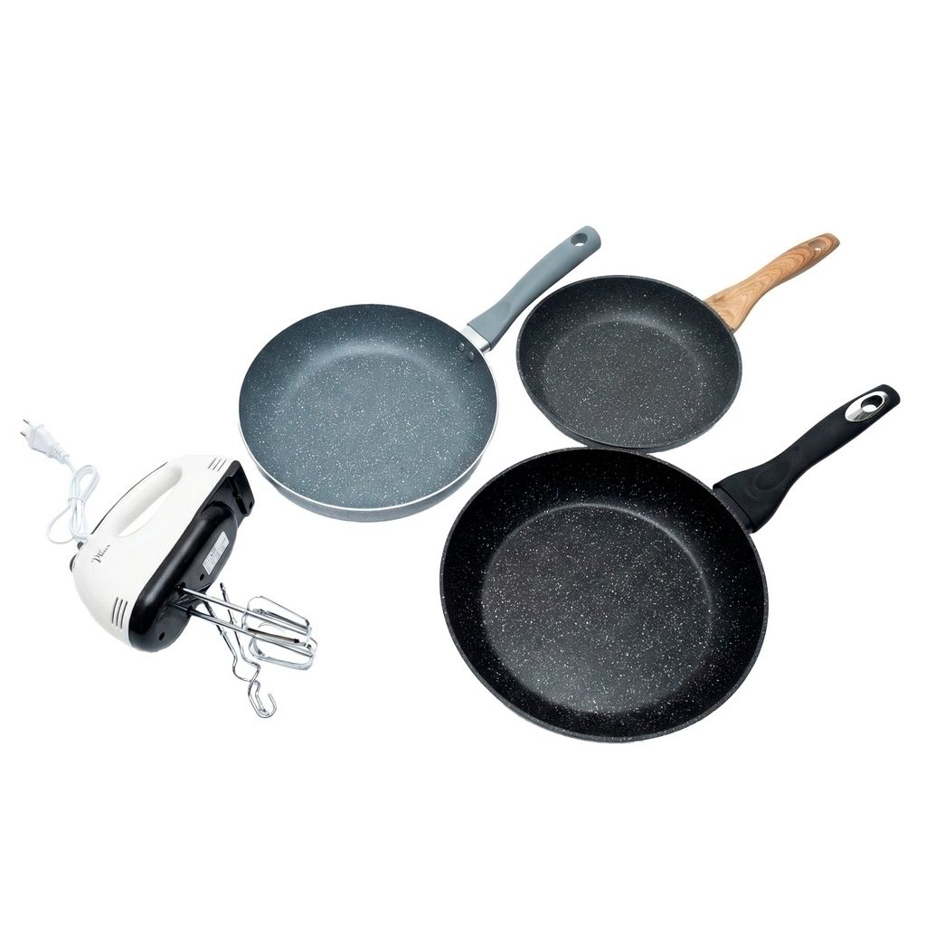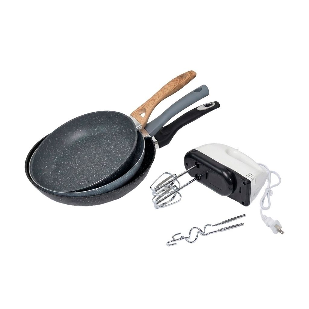 Esta solución integral para la cocina combina la versatilidad de la Batidora Portátil Scarlett con un juego de 3 sartenes marmoleados de alta resistencia. La batidora destaca por su motor con potencia eficiente de hasta 260W y 7 niveles de velocidad, permitiendo desde mezclas suaves hasta batidos rápidos con sus 4 accesorios de acero inoxidable y diseño ergonómico ligero. Por otro lado, el set de sartenes (24, 26 y 28 cm) ofrece un avanzado revestimiento antiadherente reforzado y mangos ergonómicos soft-touch con estilos únicos: un modelo de 24 cm con acabado tipo madera para desayunos, uno de 26 cm de estética minimalista para salteados, y el de 28 cm de gran capacidad con detalle metalizado ideal para paellas. Ambos productos están diseñados tanto para el hogar como para uso profesional, garantizando durabilidad, facilidad de limpieza y compatibilidad con todo tipo de cocinas, incluyendo inducción.