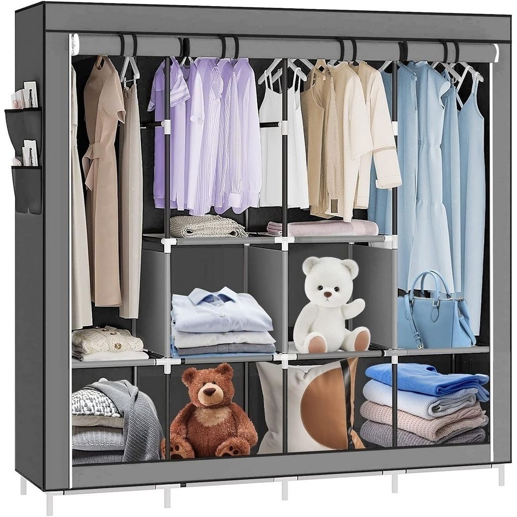Organizador de Ropa de 4 Cuerpos (Modelo 88170W) en color gris es una solución de almacenamiento modular de gran escala, diseñada para maximizar el orden en dormitorios, apartamentos o sótanos. Con unas dimensiones robustas de 170 x 45 x 170 cm, este armario portátil destaca por su estructura de cuatro secciones independientes que permiten clasificar prendas, zapatos y accesorios por tipo o estación de manera impecable.