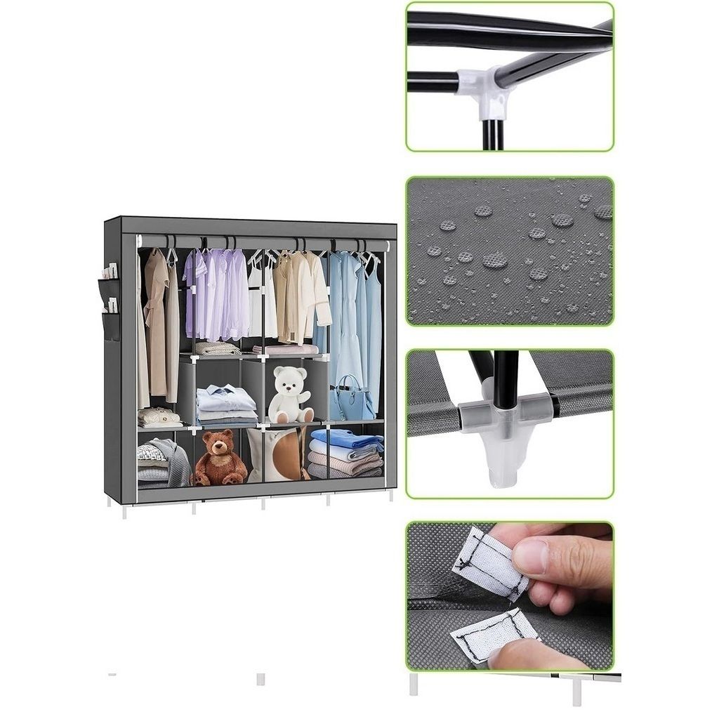 Construido con tubos de metal recubiertos y conectores de plástico PP de alta resistencia, el organizador garantiza estabilidad y durabilidad a largo plazo. Su cubierta de tela no tejida es impermeable y a prueba de polvo, lo que facilita la limpieza con un paño húmedo y mantiene la ropa fresca. Además, el diseño incluye un espacio extra en la parte inferior para ocultar calzado adicional y facilitar el aseo del suelo, ofreciendo un montaje intuitivo tipo "DIY" que no requiere herramientas externas.