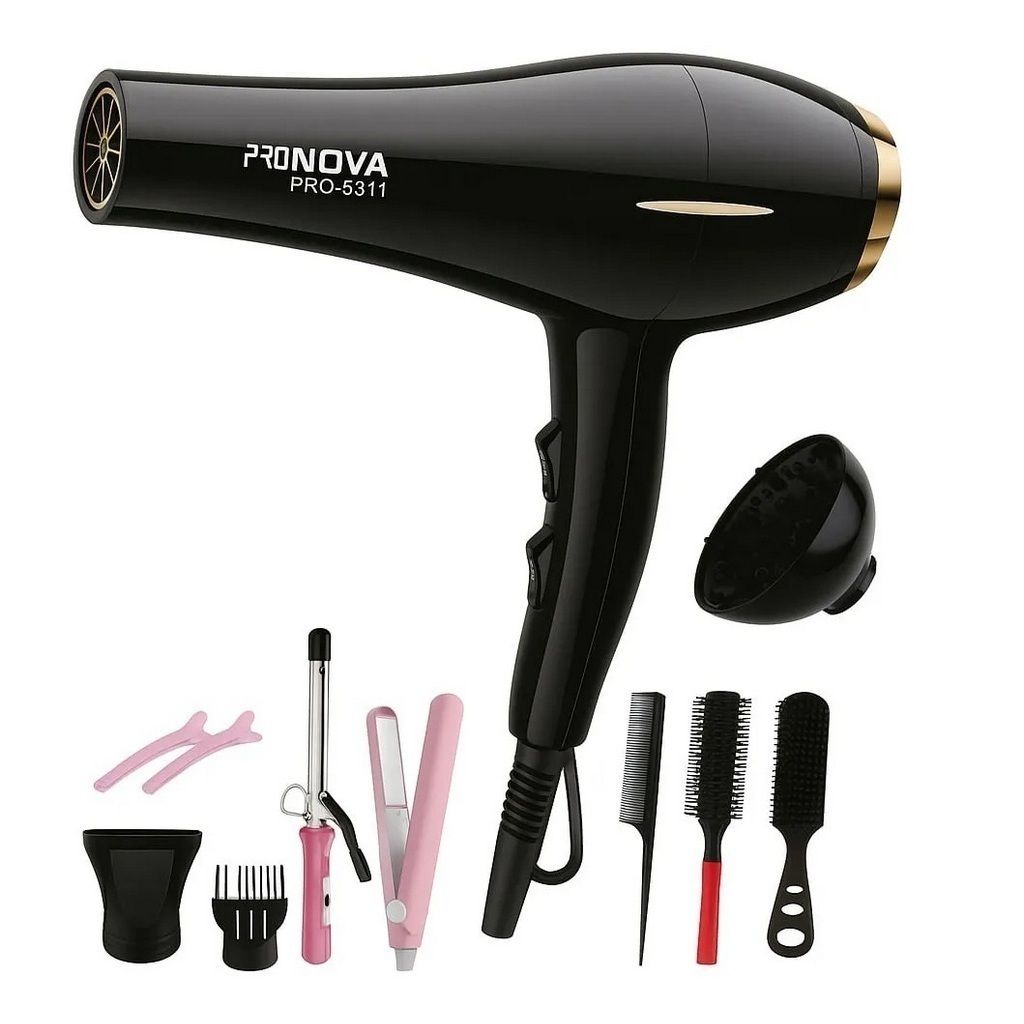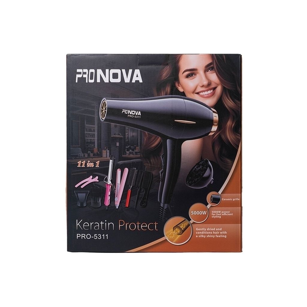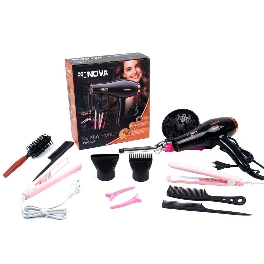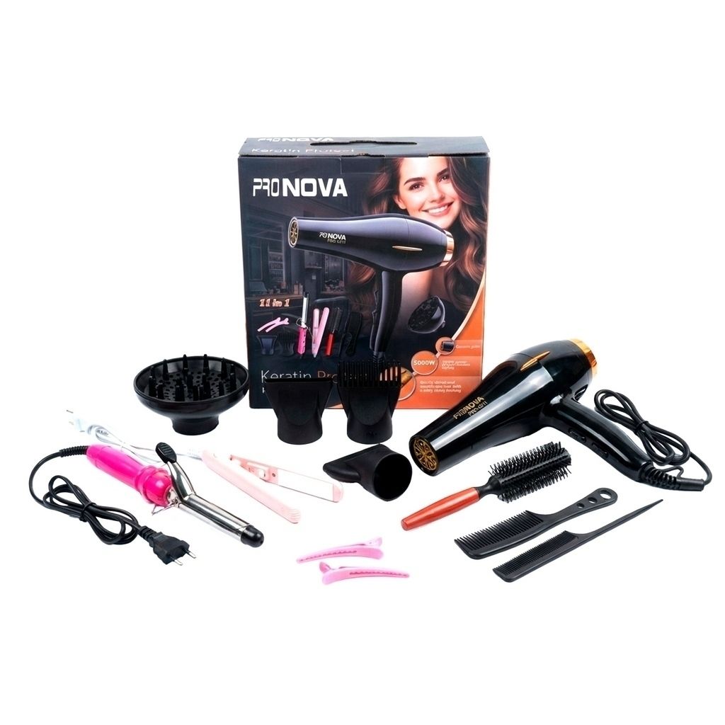 | Transforma tu rutina de belleza con el PRO NOVA PRO-5311, set de 11 en 1 un secador de alto rendimiento diseñado para lograr resultados de salón desde la comodidad de tu hogar. Su potente motor de 5000W ofrece un flujo de aire intenso y constante, reduciendo el tiempo de secado y aportando un acabado brillante, suave y sin frizz., Potencia profesional de 5000W: Secado rápido, eficiente y duradero.2 velocidades y 3 niveles de temperatura: Control total para todo tipo de cabello. Función de aire frío: Fija el peinado y mantiene el brillo natural. Diseño ergonómico y liviano: Ideal para uso prolongado sin fatiga.Boquilla concentradora y difusor: Resultados precisos y definición de rizos.Cabellos lisos, ondulados o rizados,Uso profesional en salones o estilistas independientes, secadora 5000w, mini onduladora,mini plancha ,2 clipss,cepillo, 2 peines,3 herramientas para uso de la secadora. |