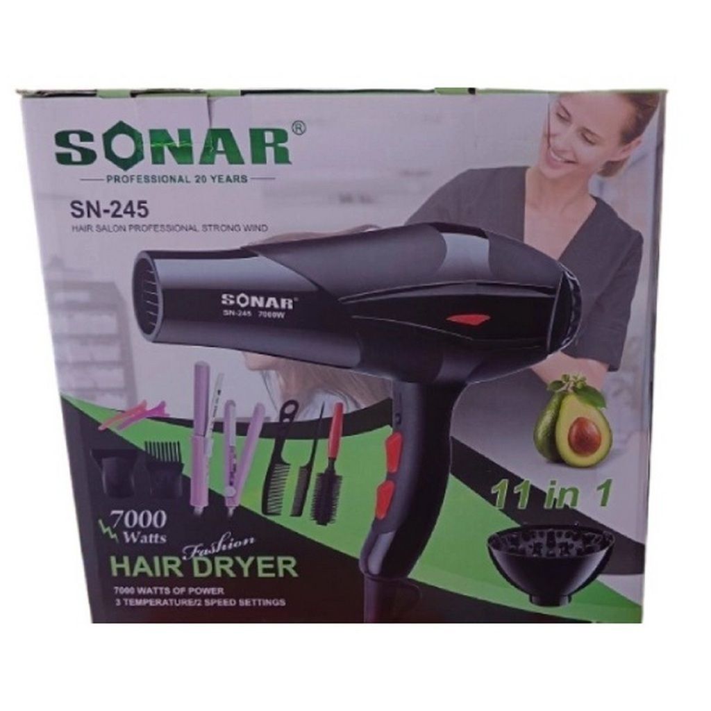 El Kit de Peluquería Profesional SONAR SN-245 11-en-1 es una solución integral de alto rendimiento diseñada para lograr acabados de salón desde la comodidad del hogar o para uso profesional. El corazón del set es un potente secador de 7000W que garantiza un secado ultrarrápido incluso en cabellos densos, ofreciendo control total mediante ajustes de temperatura y velocidad para proteger la fibra capilar. Este kit multifuncional incluye accesorios especializados como un difusor para definir rizos y dar volumen, una boquilla concentradora para alisados precisos, y una mini plancha ideal para retoques o flequillos. Complementado con un juego de peines, cepillos y clips, el sistema SN-245 permite crear desde estilos lisos perfectos hasta bucles voluminosos, simplificando la rutina de belleza con herramientas ergonómicas, potentes y versátiles.
